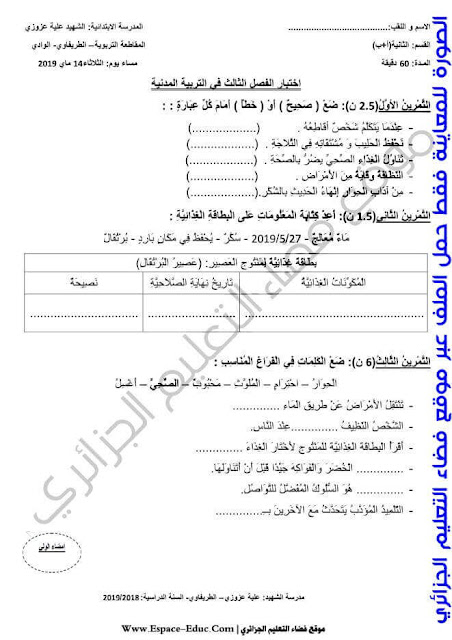 امتحانات التربية المدنية للفصل 3 سنة 2 ابتدائي