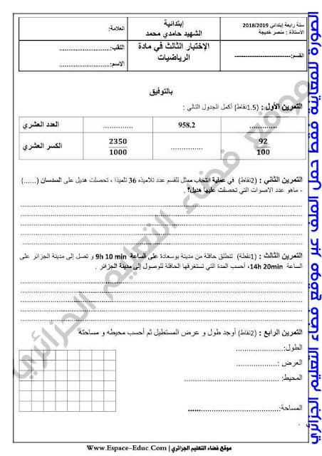 اختبارات السنة الرابعة ابتدائي للفصل الثالث في الرياضيات